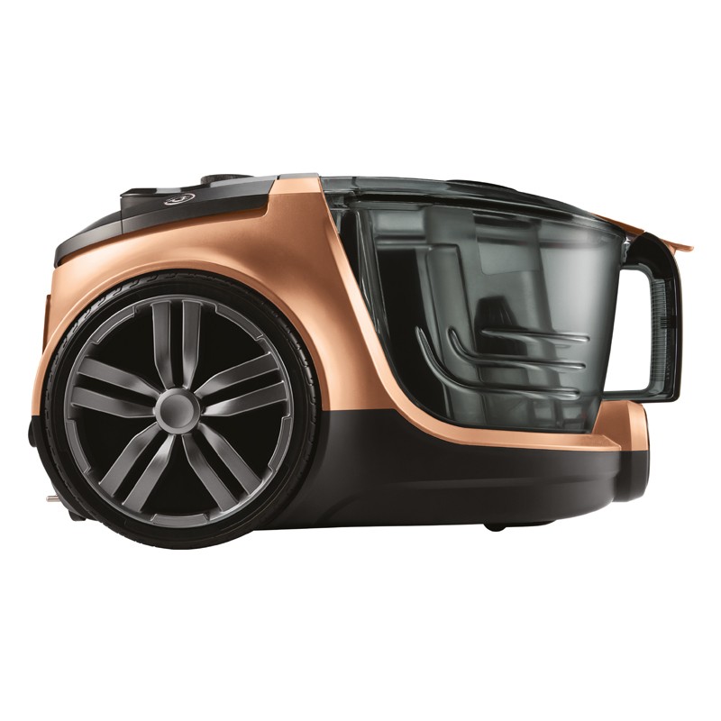 Aspirateur Sans Sac FOCUS - Puissance : 2400 Watts - Capacité du bac à poussière : 3.15 Litres - Technologie cyclonique - Filtration de qualité HEPA - Silencieux avec un niveau sonore de 73dB - Rayon d’action de 12 m - Tube de 1.6m - Accessoires : brosse pour sols durs Parke, suceur plat, suceur pour tissus d’ameublment - Rangement pour accessoires - Longueur du Câble : 8 m - Alimentation : 220/240 V - 50/60 Hz - Couleur : Noir&Copper - Garantie : 2ans
