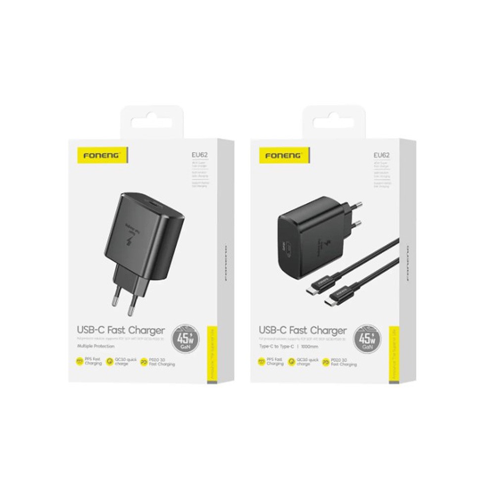 Le chargeur mural FONENG EU62 associe puissance et compacité. Grâce à la technologie GaN, il délivre jusqu’à 45 W dans un boîtier très compact (~88.5 × 53.5 × 29.8 mm). Il supporte les standards de charge rapide modernes (PD, PPS, QC), ce qui le rend très adapté aux smartphones, tablettes et certains ordinateurs portables légers. Branché sur la prise secteur universelle (110-240 V), il conviendra tant à la maison qu’en déplacement. Choisissez-le en noir ou blanc, pour une finition élégante.