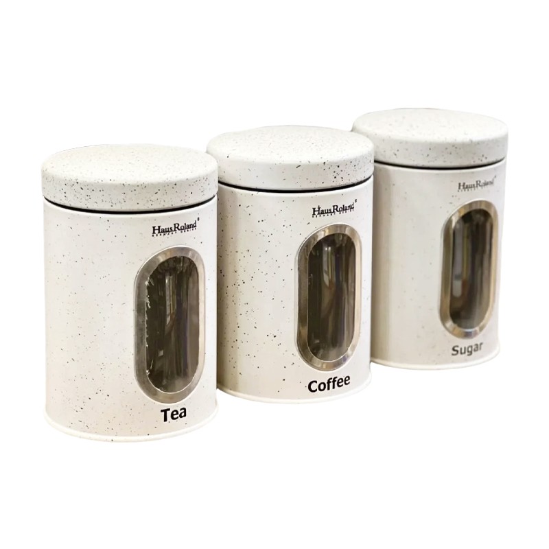 Boîte de rangement en métal (3 pièces)Matériau : Étain Contenance : 500 mlDétails du produit :1 boîte de sucre, 1 boîte de thé, 1 boîte de café,Disponible en blanc