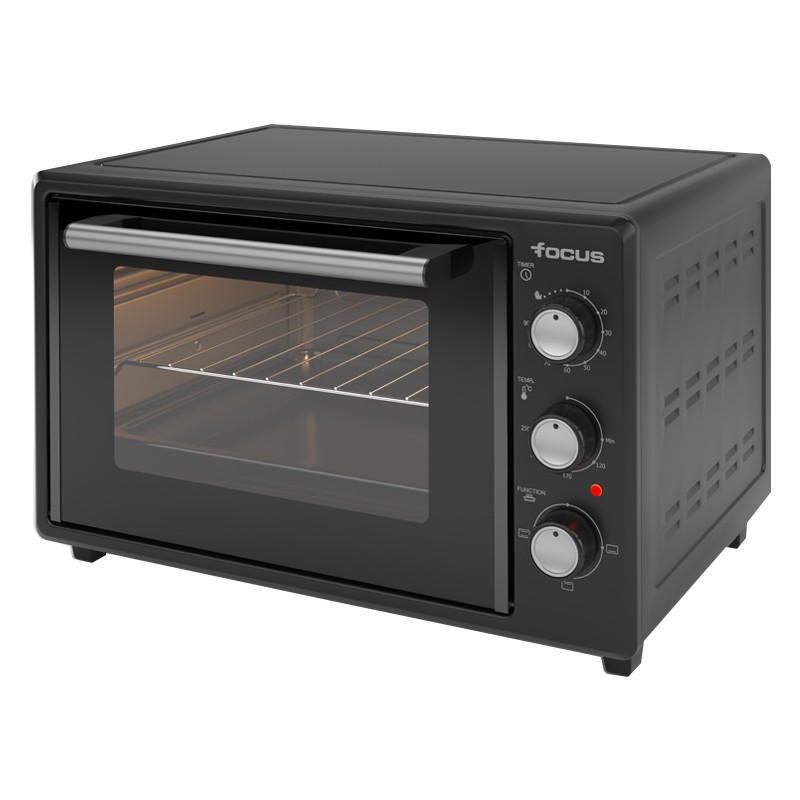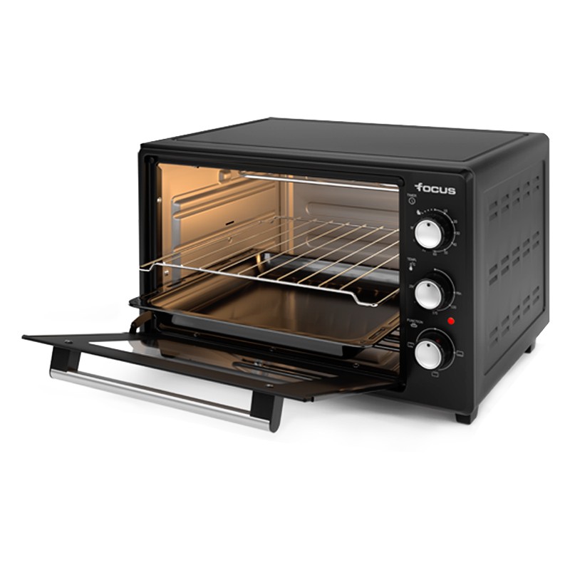 Four Électrique Focus - Puissance : 1800 Watts - Volume : 35 Litres - Température : Réglable jusqu'à 250°C - Minuterie : 90 min - 4 Fonctions - Alimentation : 220-240V/50-60hz - Lampe - Résistance Inox - 1 x Grill - 1 x Plateau rectangulaire - Dimensions : L x H x P : 50.5 x 32.45 x 37.96 cm - Couleur : Noir - Garantie : 1an