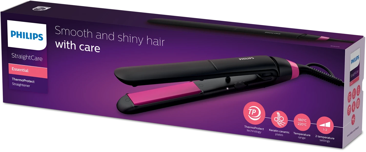 Lisseur ThermoProtect Philips StraightCare Essential BHS375/00 - Plaques en céramique et kératine pour des cheveux brillants et lisses - Technologie thermoprotect pour protéger les cheveux contre les risques de surchauffe - Plaques longues de 100 mm pour un lissage facile et rapide - 2 réglages de température, jusqu'à 220°C - Chauffe rapide, prêt à l'emploi en 60 secondes - Fonction de verrouillage pour un rangement simple et sécurisé - Plaques longues 28 x 100 mm - Couleur Noir - Garantie 1 an
