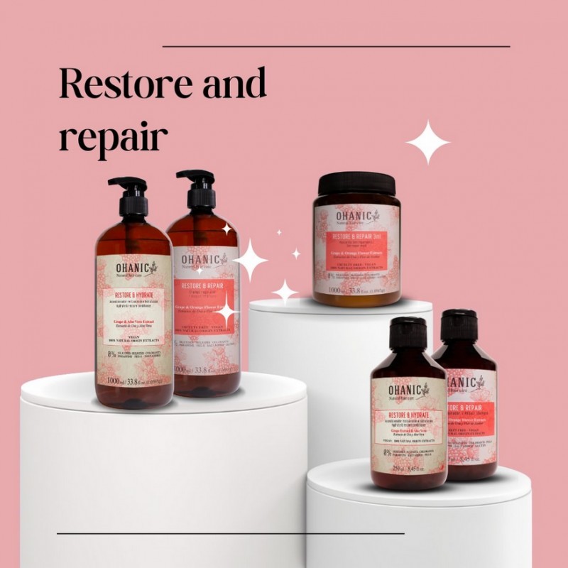 Le masque 3 en 1 Ohanic Restore & Repair est formulé avec des extraits de raisin et de fleur d'oranger, parfait pour réparer en profondeur les cheveux secs et abîmés.
