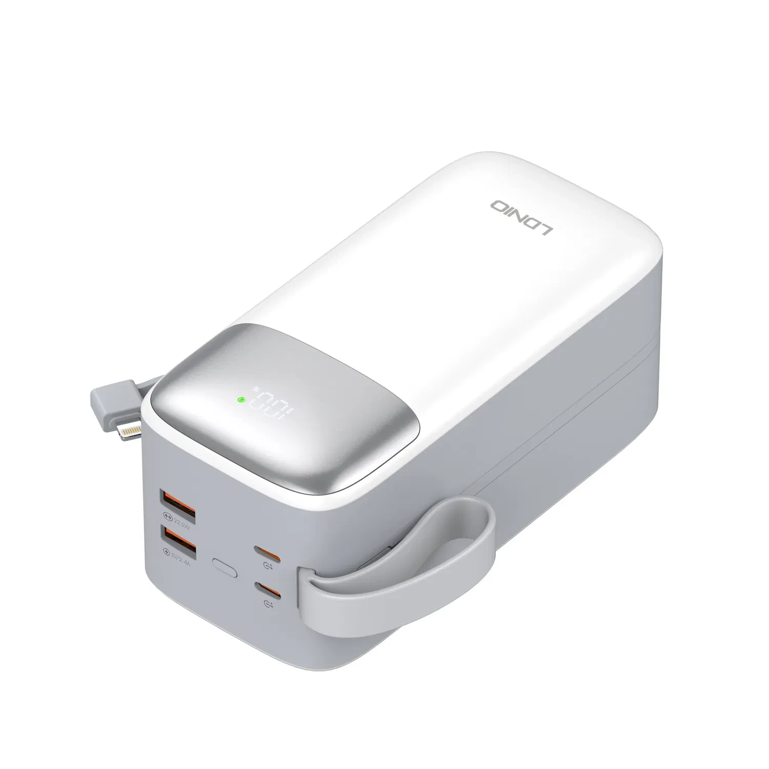 Power Bank  Ldnio Pq50 50 000 mAh, charge rapide 4 ports (2 A + 2 C), câbles USB-C/Lightning intégrés, affichage LED, chargeur portable certifié CE