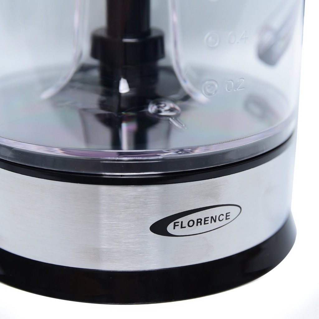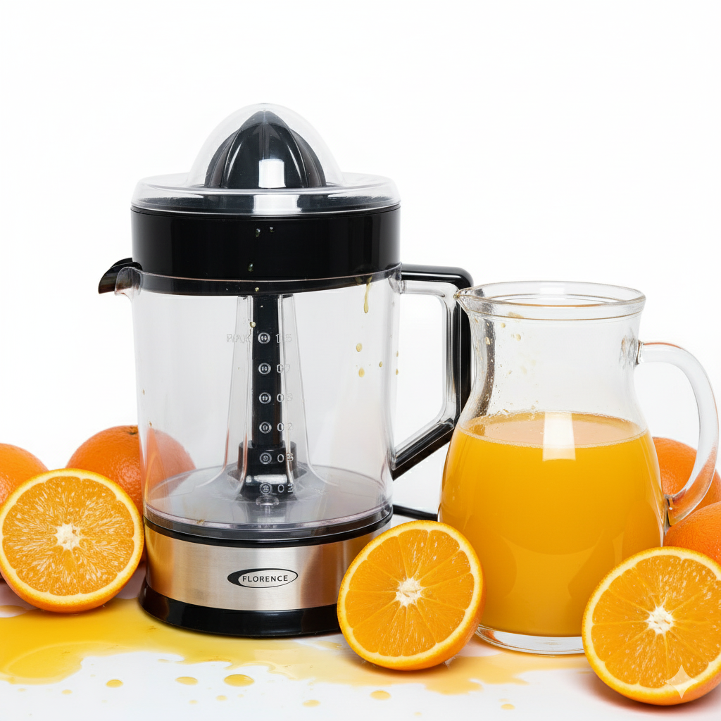 Presse-Agrume Électrique 1.2L 50W - Florence HK-408 - Marque : Florence - Tension : 220V~50Hz - Puissance : 50W - Capacité : 1.2L - Moteur en cuivre pur 4428 - Corps en acier inoxydable 430 + plastique PP - Deux cônes de pressage - Rotation dans les deux sens pour une extraction maximale du jus - Matériau de qualité alimentaire, sûr et sain - Pièces détachables pour un nettoyage facile - Pieds antidérapants - Garantie 12 mois.
