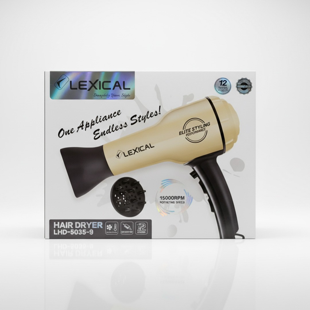 Sèche-cheveux Lexical LHD-5035 - Voltage: 220-240 V ~ 50/60 Hz - Puissance: 1800 W - Vitesses: 2 niveaux de vitesse - 3 niveaux de chauffage - Fonction vent froid - Moteur entièrement en cuivre - Vitesse de rotation: 15 000 tr/min - Protection contre la surchauffe - Accessoires: buse de concentration, buse de diffusion volumisante - Garantie : 12 Mois