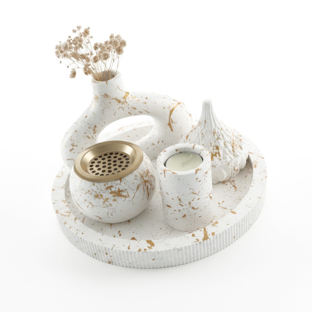 Apportez une touche de raffinement et de sérénité à votre intérieur avec ce set décoratif en  plâtre effet marbré blanc et doré. Composé d’un encensoir, d’un bougeoir, d’un vase décoratif et de leurs accessoires assortis, l’ensemble repose sur un plateau harmonieux au design minimaliste.